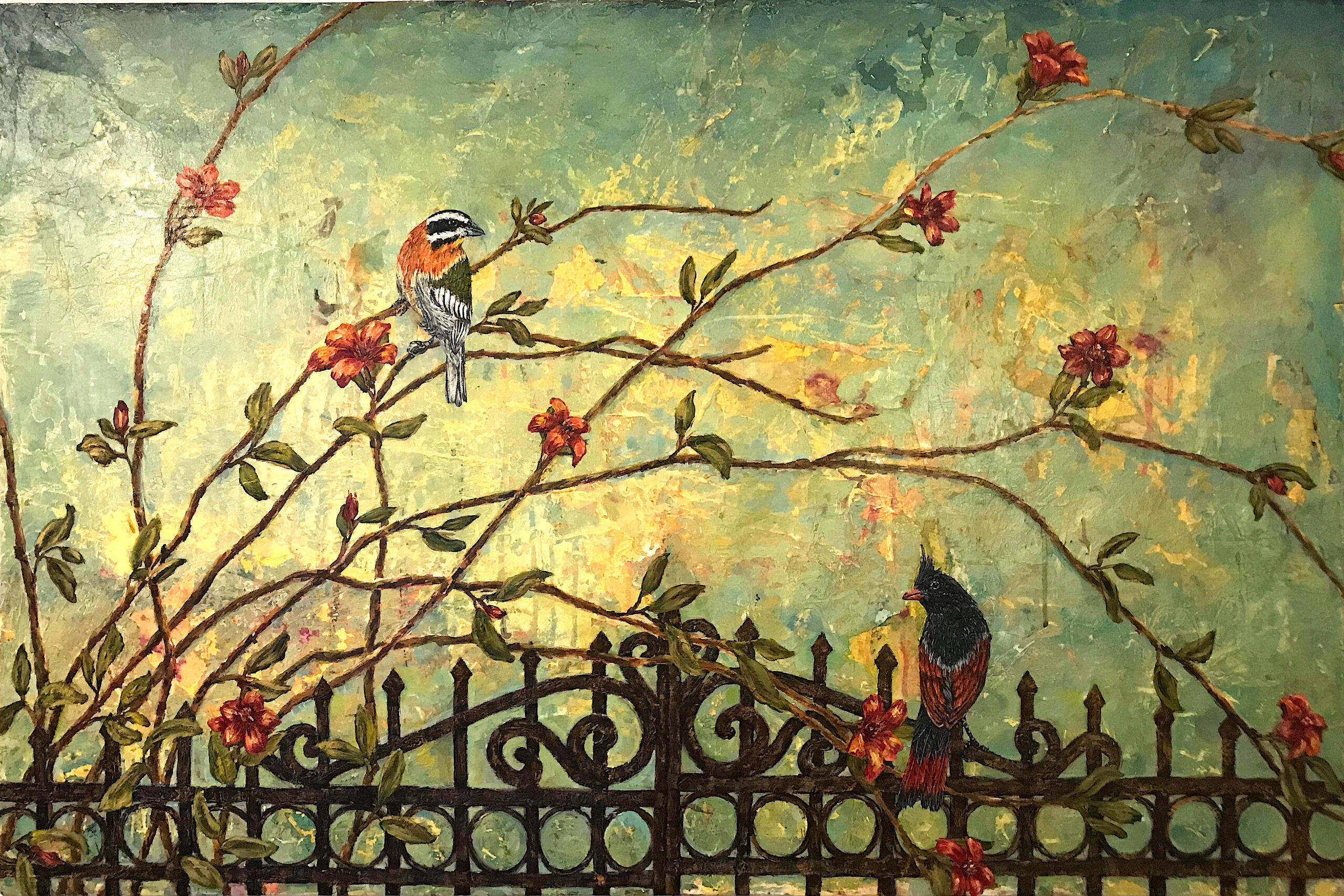 My mixed media paintings, inspired by folk art, mythology, symbols, and nature, focus on the fine balance of extremes and everyday observations of life. My paintings contain images both figurative and botanical, while the surfaces retain lush colors and a rich weathered texture. I incorporate printmaking, collage, pattern, and text into the process, creating contemporary icons through a variety of media. I consider my work a meditation on the common threads interwoven throughout time.