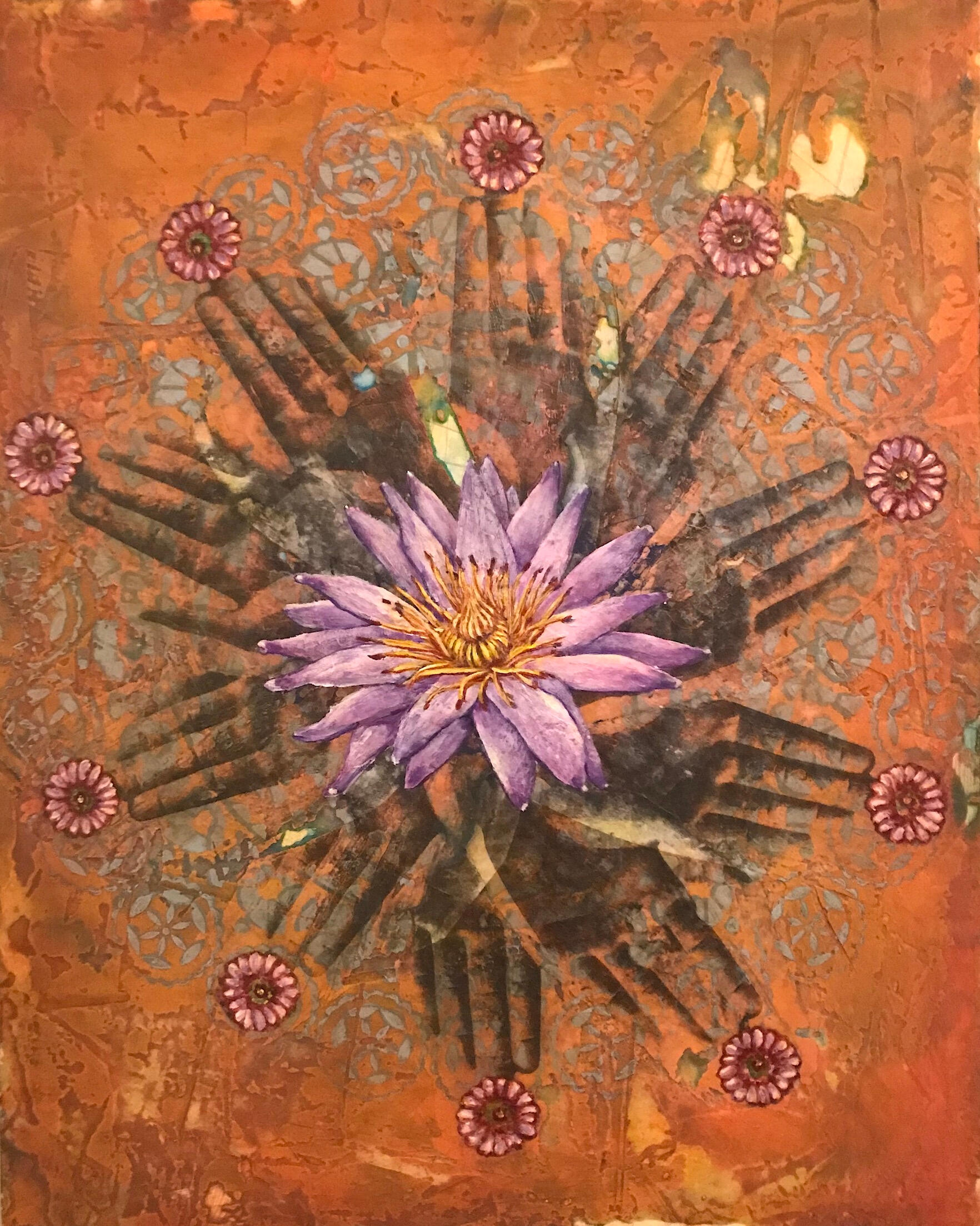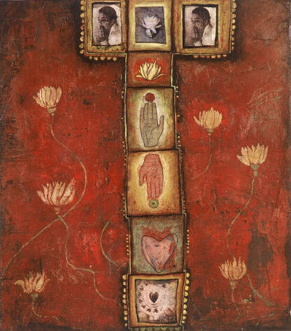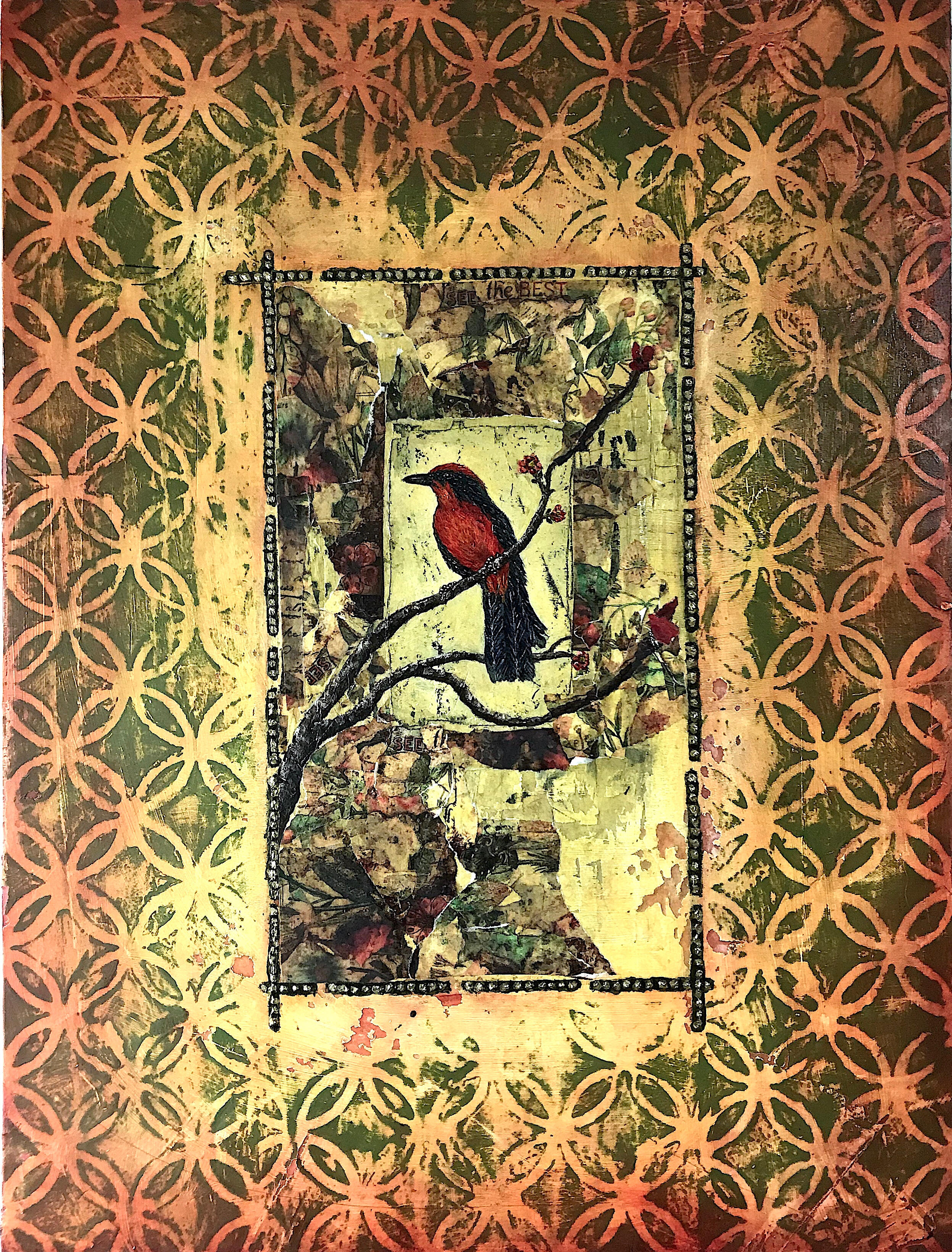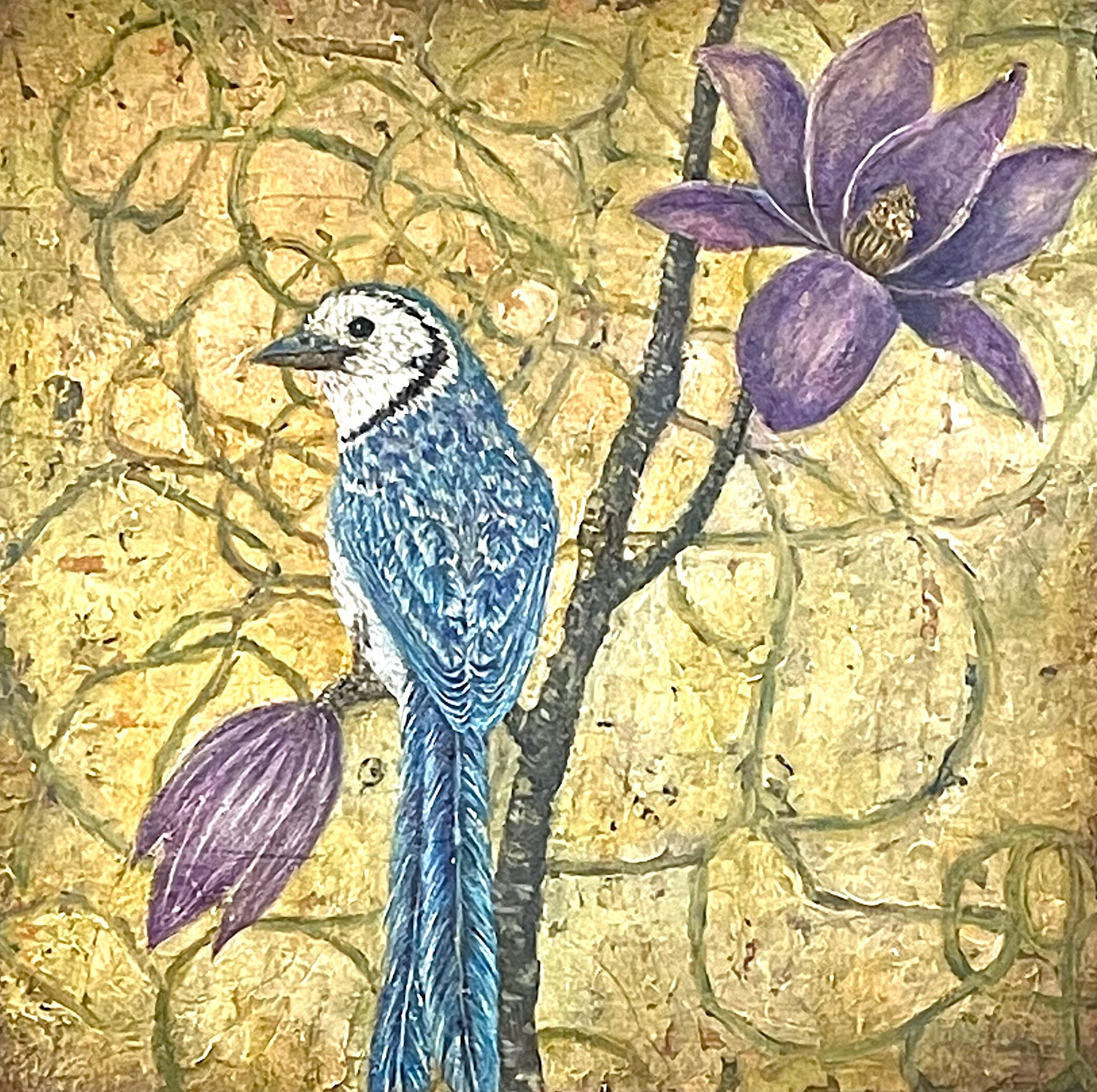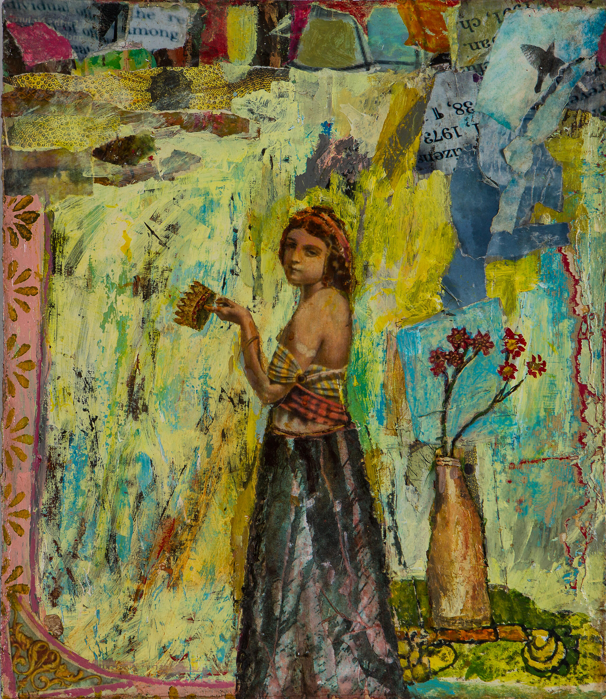 My mixed media paintings, inspired by folk art, mythology, symbols, and nature, focus on the fine balance of extremes and everyday observations of life. My paintings contain images both figurative and botanical, while the surfaces retain lush colors and a rich weathered texture. I incorporate printmaking, collage, pattern, and text into the process, creating contemporary icons through a variety of media. I consider my work a meditation on the common threads interwoven throughout time.