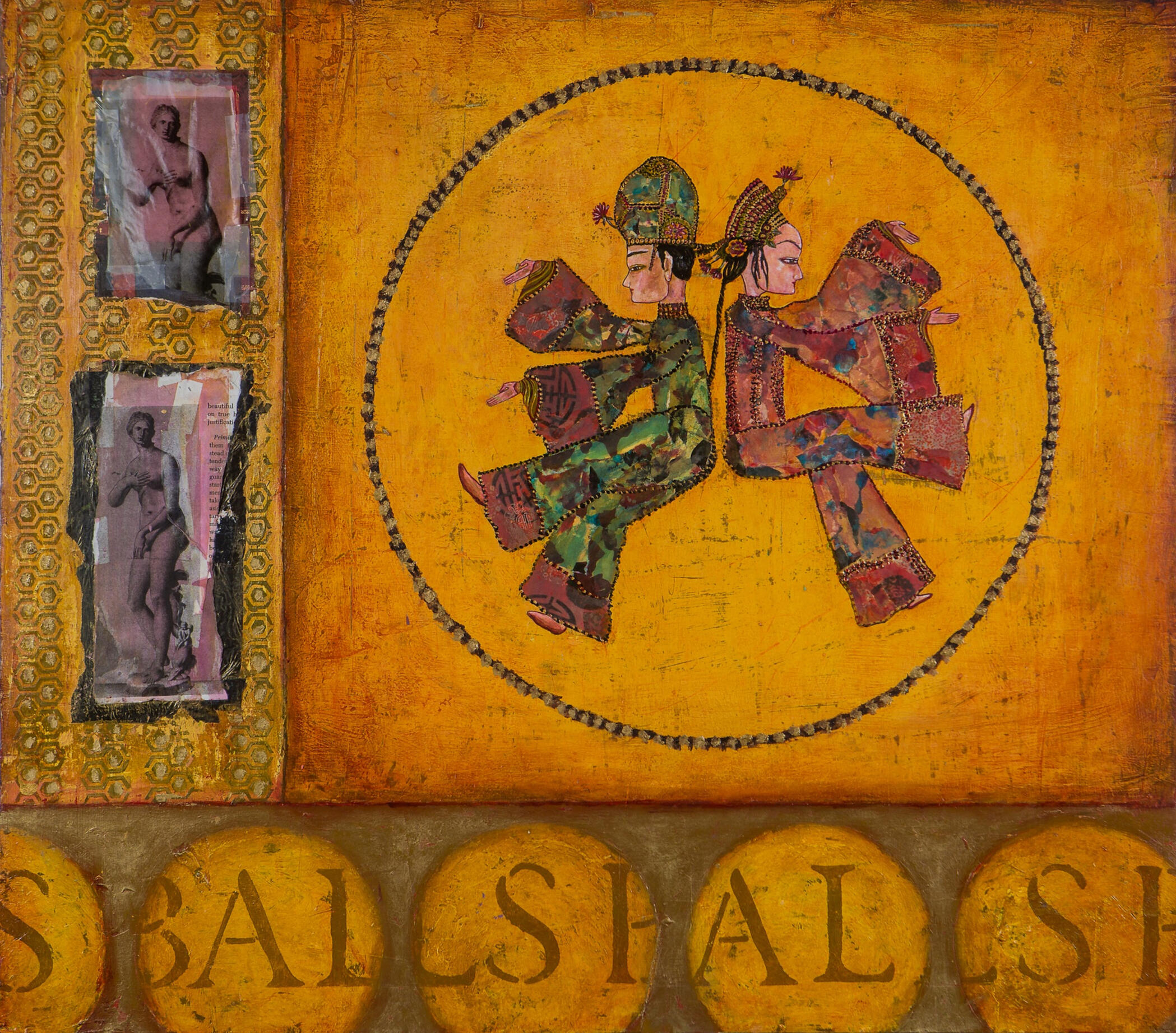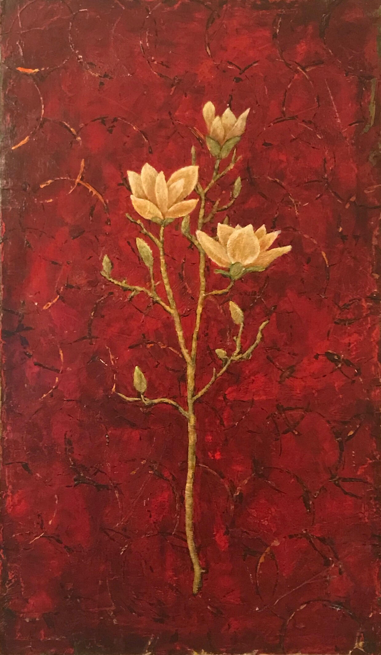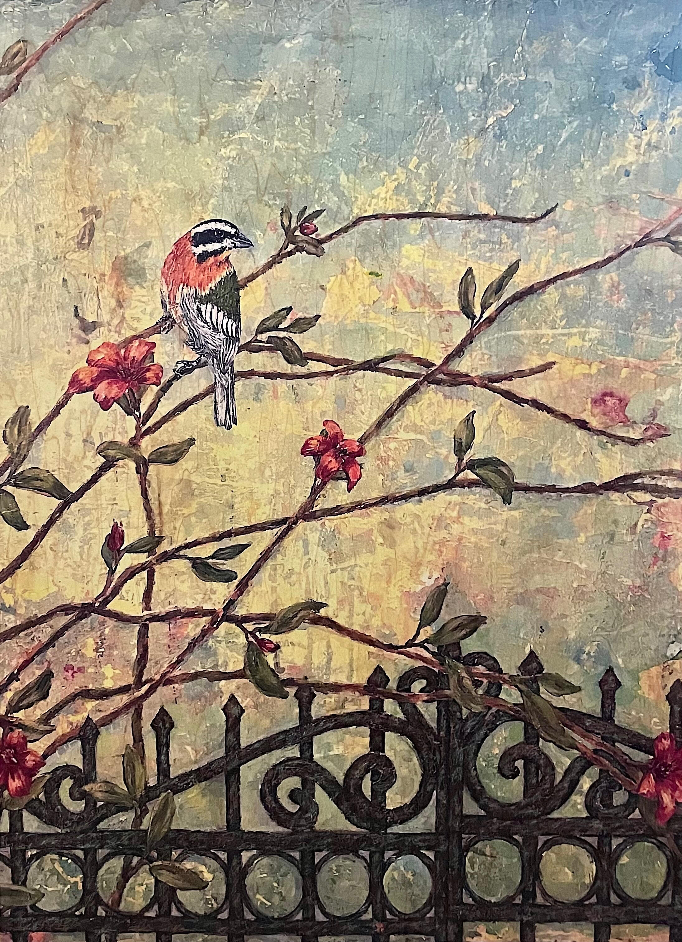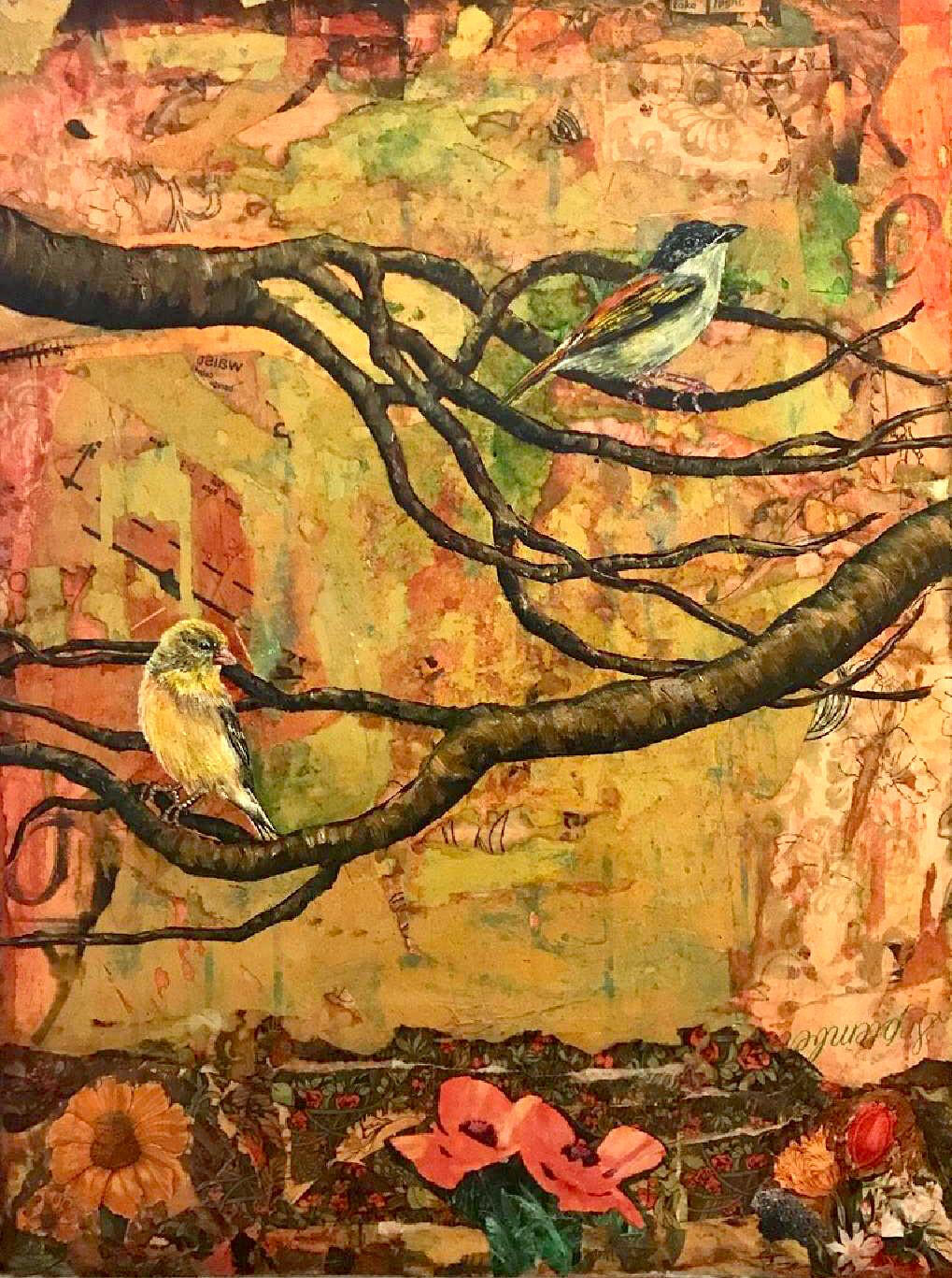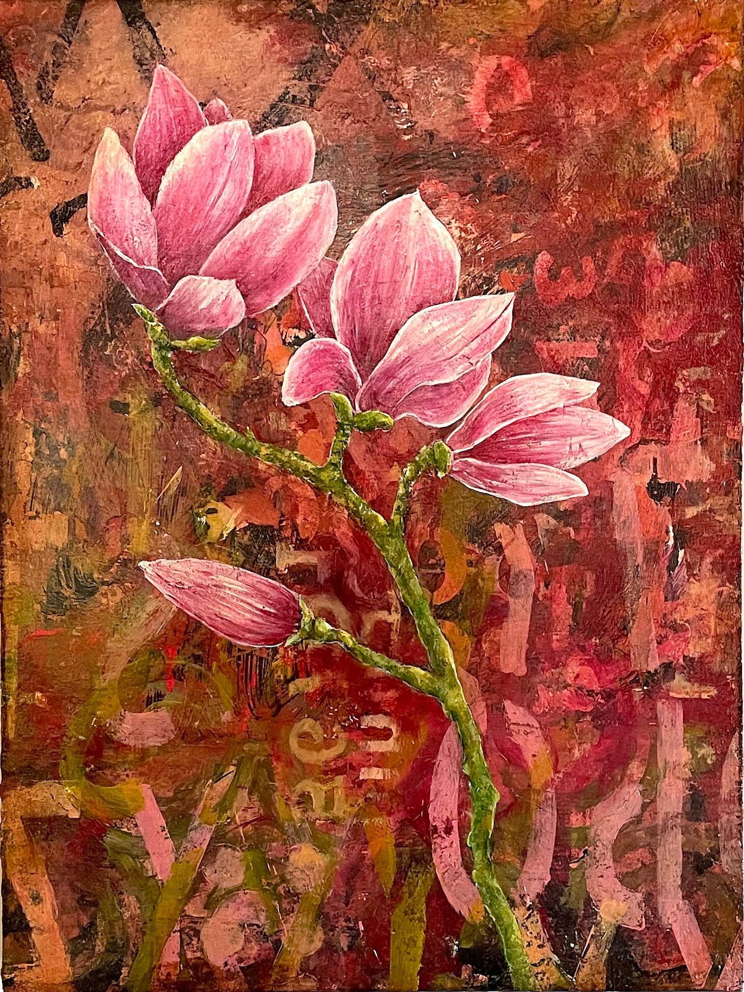 My mixed media paintings, inspired by folk art, mythology, symbols, and nature, focus on the fine balance of extremes and everyday observations of life. My paintings contain images both figurative and botanical, while the surfaces retain lush colors and a rich weathered texture. I incorporate printmaking, collage, pattern, and text into the process, creating contemporary icons through a variety of media. I consider my work a meditation on the common threads interwoven throughout time.