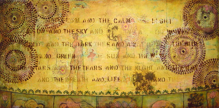 the circleThe images in my work evolve from an observation of our physical world and my internal thoughts. Archetypes, Icons and mythological figures share space with childlike scrawls, poetry and graphic images. Interwoven, these elements convey a multilayered content partnered on a scarred yet sensuous surface.I paint, etch and draw both abstracted and figurative elements onto my panels. I like to combine techniques and play with mixed media. My work evolves spontaneously and intuitively and I welcome happy accidents.Taken for granted in the enormity of a falling leaf, a spoken word, the transience of life.